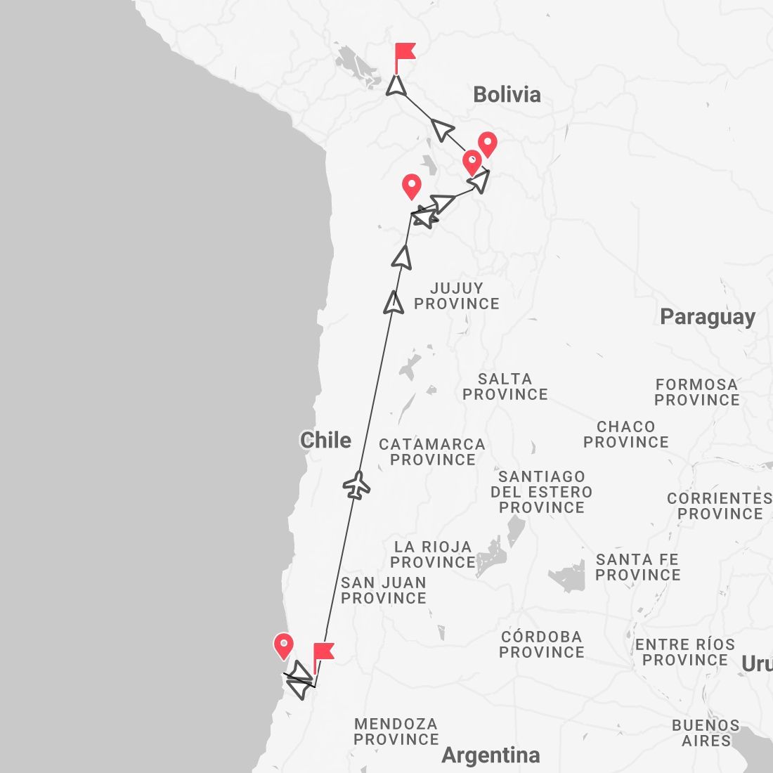 This adventure takes you on a journey through some of the most stunning landscapes between Chile and Bolivia, offering an experience that feels like stepping onto another planet. Starting in Santiago and the vibrant Valparaíso, you'll head north to San Pedro de Atacama, a desert oasis at 2,500m above sea level. Here, marvel at the otherworldly Valle de la Luna and the world’s highest geothermal field, El Tatio, with its 64 active geysers. Enjoy the desert’s natural beauty, including swimming in its lagoons and stargazing on an astronomical tour under the southern hemisphere’s skies.