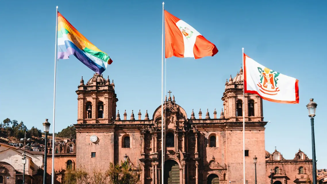 A rainbow flag, the flag of Peru, and the flag of Cusco waving on flagpoles in front of a large stone cathedral.